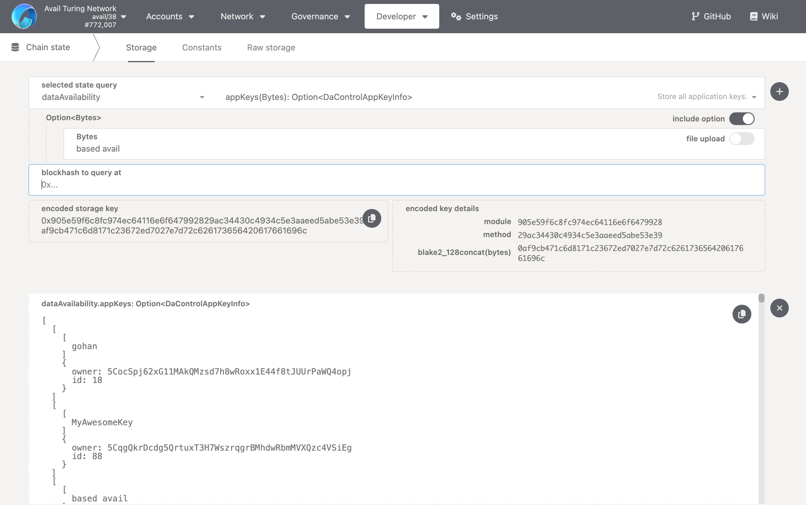 include optiontoggle, and enterbased availas thebytesinput. Call the function. What do you see? You will be returned a pair ofownerandid, which together with thekeyyou entered, form a uniqueappID.